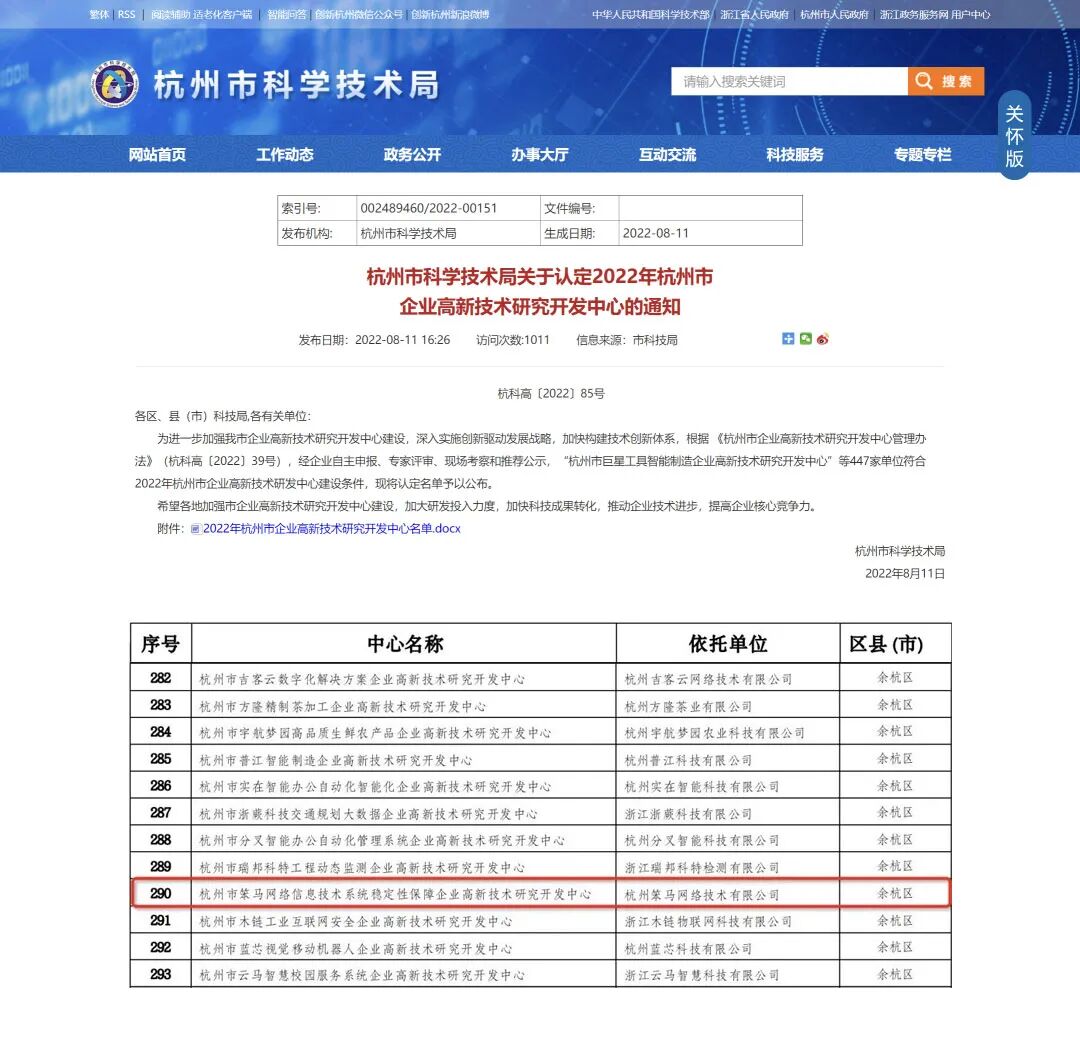 近日,杭州市科学技术局正式下发《关于认定2022年杭州市企业高新技术研究开发中心的通知》。